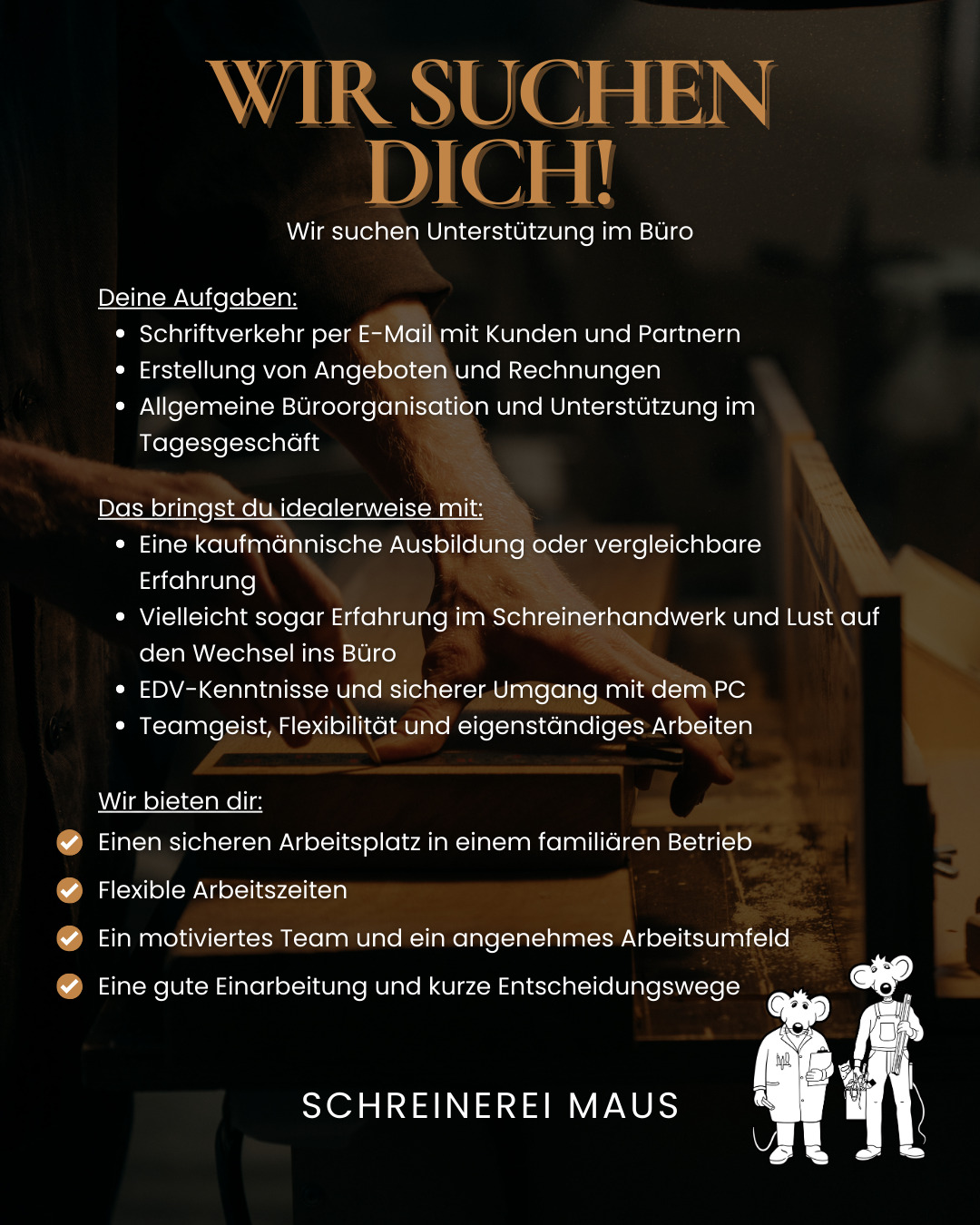 Du hast Bock auf ein starkes Team, ehrliche Arbeit und ein gutes Miteinander? Dann komm zu uns! π Bei uns erwartet dich: πΈ Ein familiäres Betriebsklima πΈ Übertarifliche Bezahlung πΈ Abwechslungsreiche Aufgaben – kein Tag ist wie der andere! Werde Teil von #TeamMaus und bewirb dich jetzt als Schreiner:in (m/w/d) unter π www.schreinerei-maus.de #SchreinereiMaus #TeamMaus #Handwerk #SchreinerJobs #WiesbadenBierstadt #HandwerkMitHerz #JobsImHandwerkButton