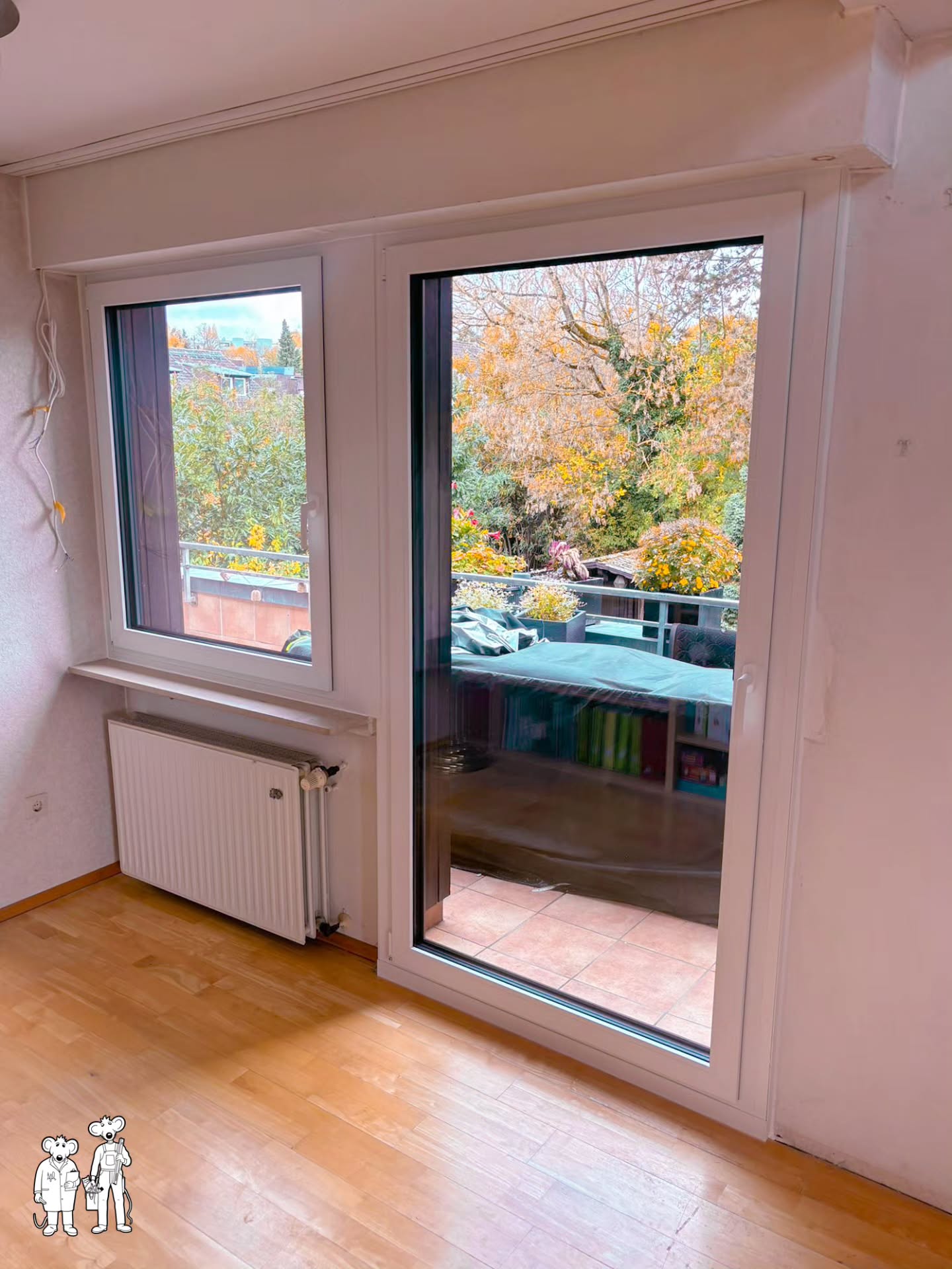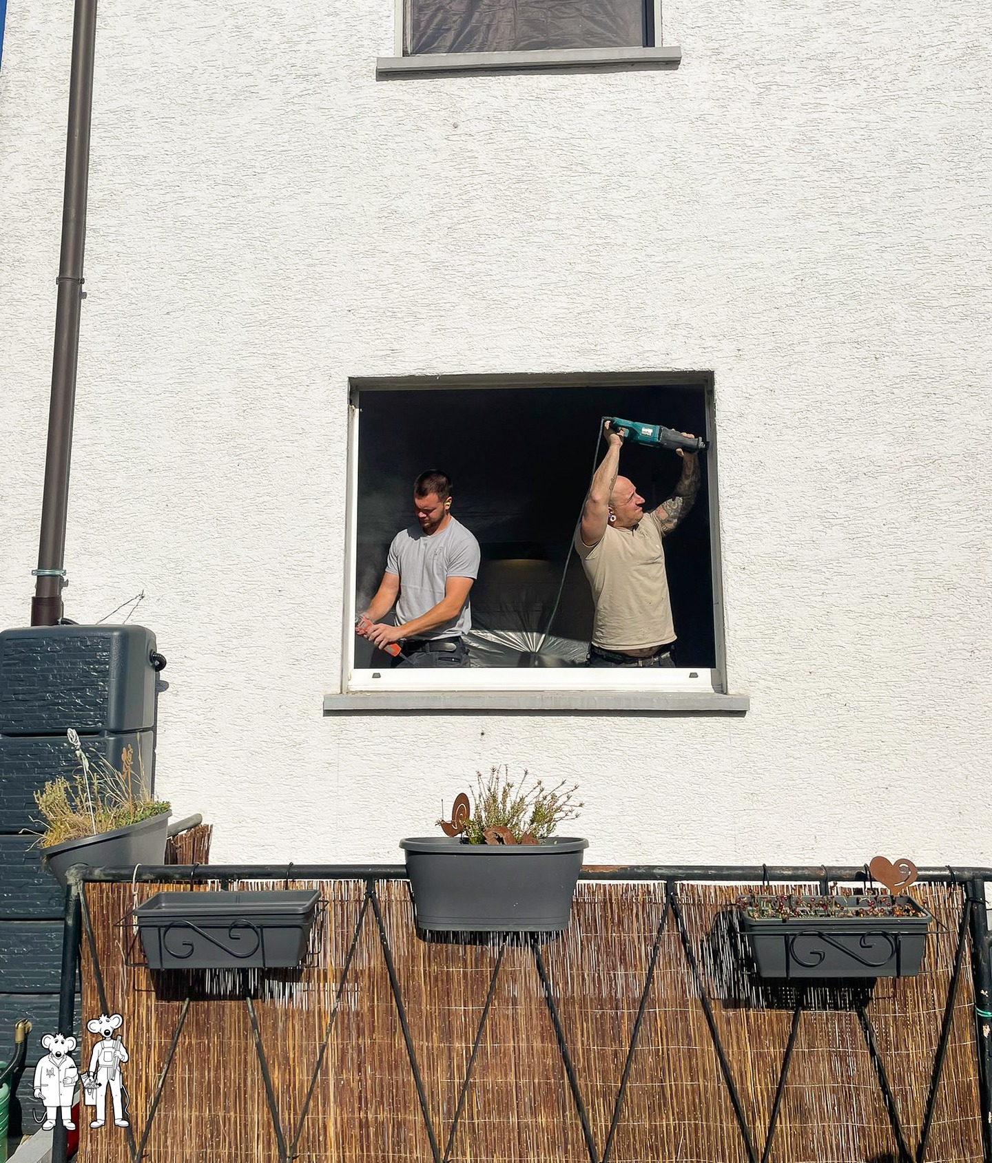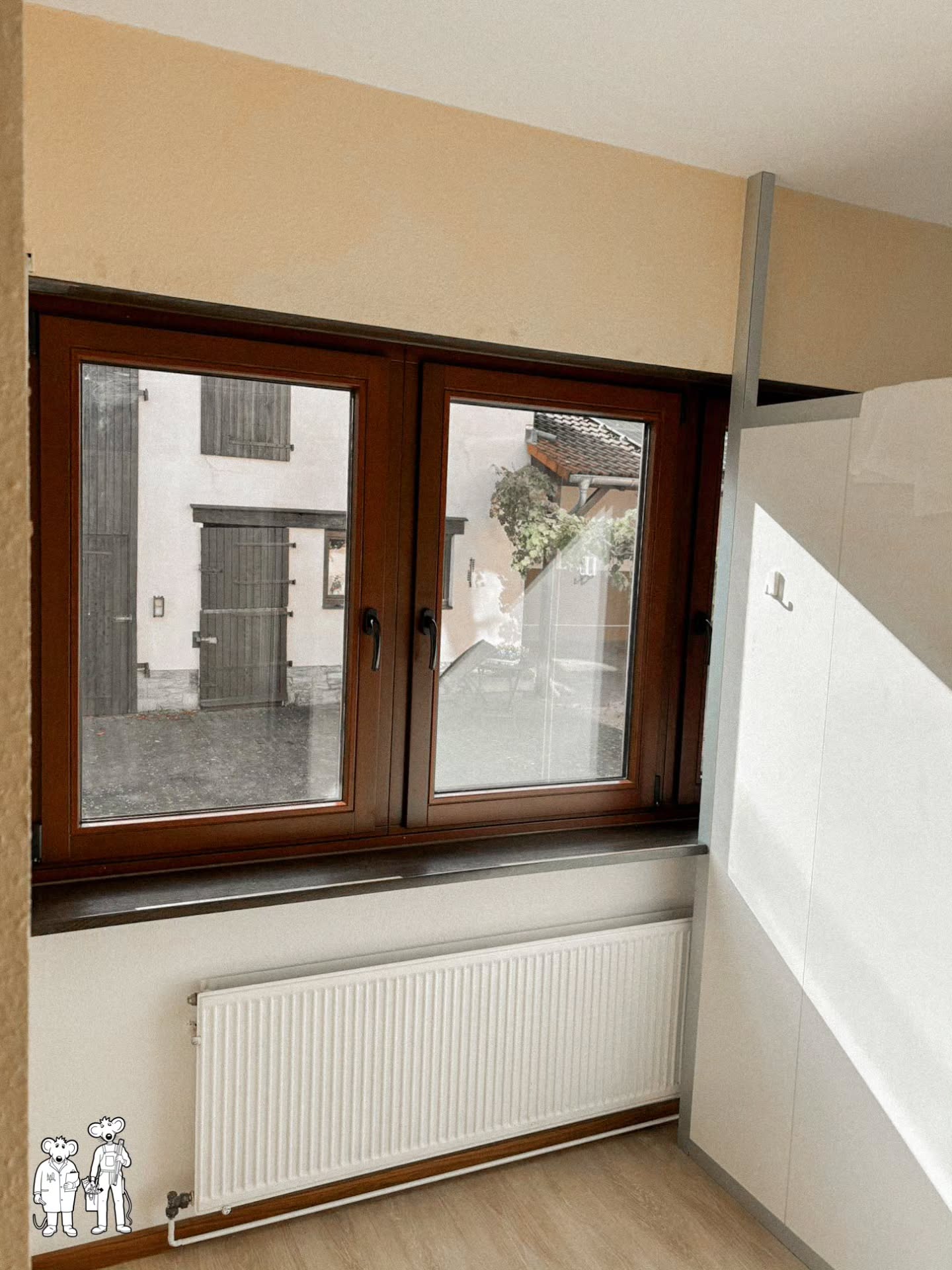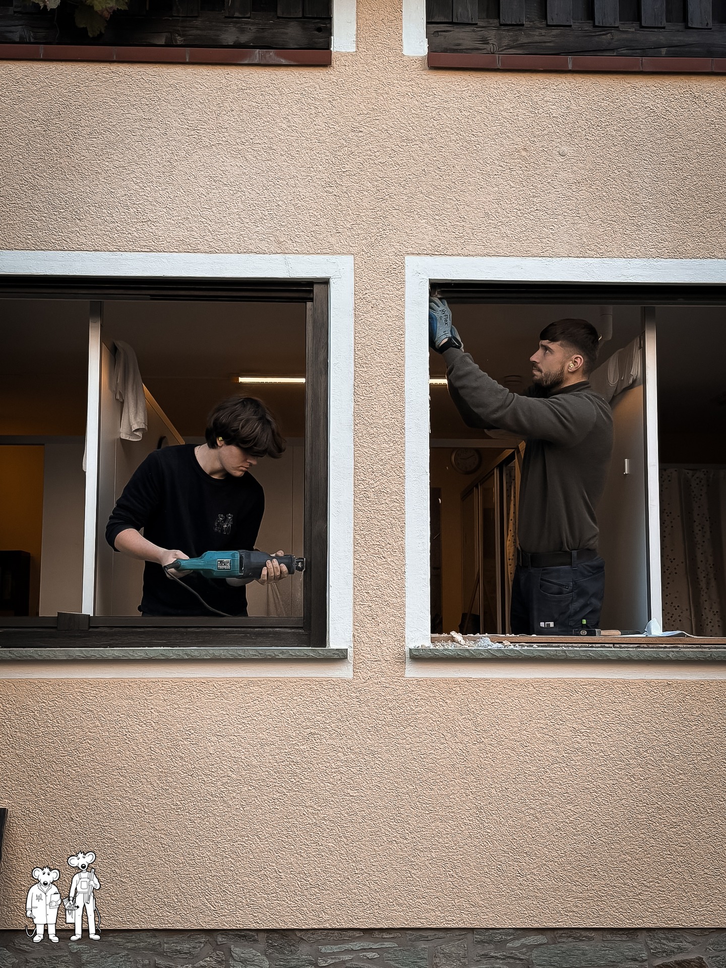 Fenstertausch mit Ausblick! Hier seht ihr Timo (links) und Lennard (rechts) beim fachgerechten Einbau eines neuen Fensters – mit viel Einsatz und einem tollen Blick ins Grüne. Wir wünschen euch allen einen wunderbaren Tanz in den Mai – genießt den Frühling und bleibt handwerksverliebt! #SchreinereiMaus #Wiesbaden #Fenstertausch #TanzInDenMai #HandwerkMitHerz #TeamworkButton