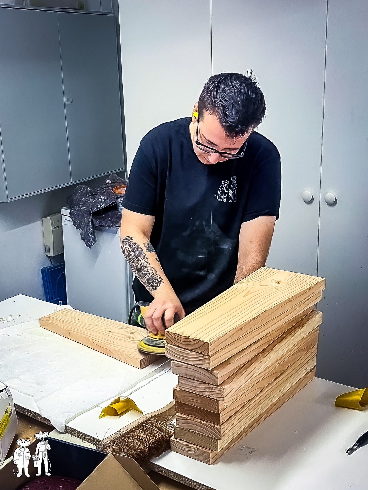 π₯οΈβ‘οΈπͺ Vom Büro in die Werkstatt – hier packt jeder mit an! #SchreinereiMaus #HandwerkLiebe #TeamMausButton